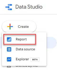 Berichte sind das, was Looker Studio so wunderbar macht! Eine andere Möglichkeit, einen neuen Bericht zu erstellen, besteht darin, auf die Schaltfläche +Erstellen in der oberen linken Ecke des Startbildschirms zu klicken und im Dropdown-Menü Bericht auszuwählen.
