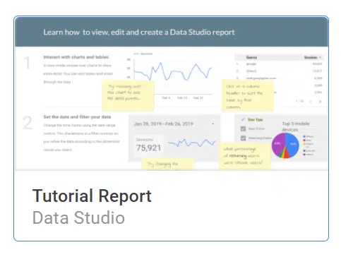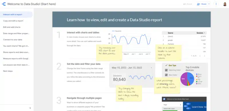 Sie werden dann zu einem visuellen, interaktiven Tutorial weitergeleitet, das Sie Schritt für Schritt durch die Möglichkeiten von Looker Studio und die ersten Schritte führt. Überprüfen Sie dies unbedingt.