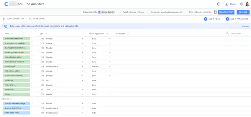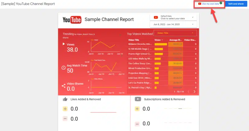 Hier ist ein Beispiel für ein verbundenes YouTube-Konto, sodass Sie Berichte über die Anzahl der Videofreigaben, Aufrufe, durchschnittliche Wiedergabezeit und mehr erstellen können.