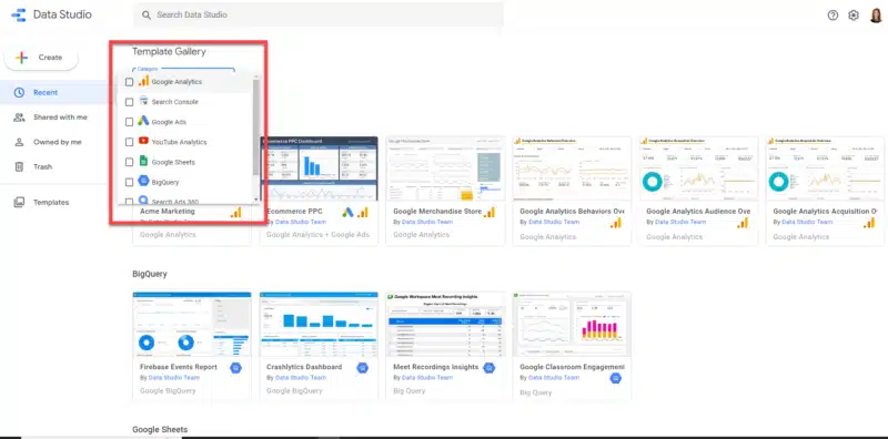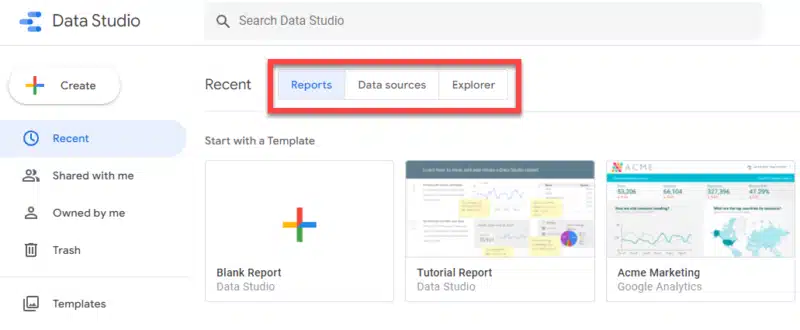 Looker Studio verwendet die Google Drive-Oberfläche, daher ist es Ihnen vertraut, wenn Sie eines der verschiedenen Google-Produkte verwenden.