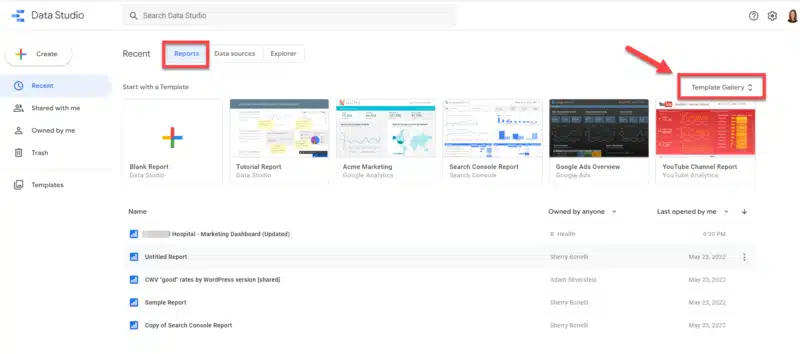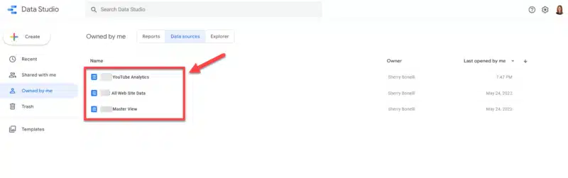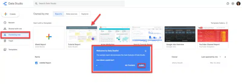 Wenn Sie neu bei Looker Studio sind, gehen Sie am besten die exemplarische Vorgehensweise „Willkommen bei Looker Studio“ durch. Um dorthin zu gelangen, klicken Sie auf der linken Seite auf „Owned By Me“.