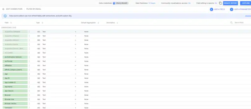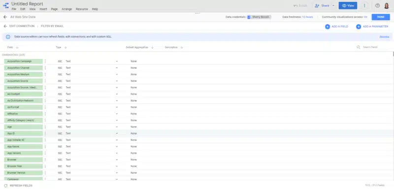 Dadurch werden alle verschiedenen Felder angezeigt, die Sie für Ihre Berichte verwenden können. Klicken Sie auf Feld hinzufügen, um mit dem Hinzufügen der Metriken zu beginnen, die Sie in Ihren Berichten messen möchten.