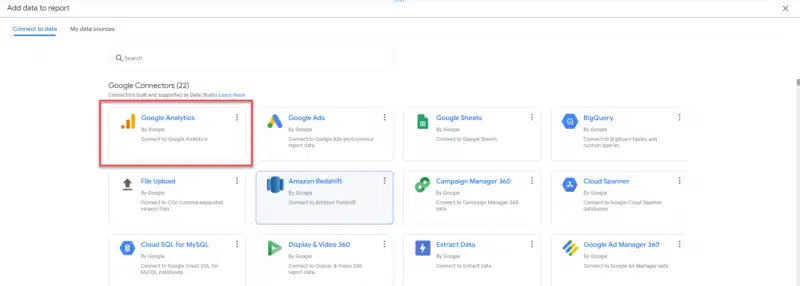 Als nächstes werden Sie aufgefordert, einen „Connector“ auszuwählen. Für die meisten Menschen ist Google Analytics eine der Metriken, die Sie in Ihren Berichten anzeigen möchten.
