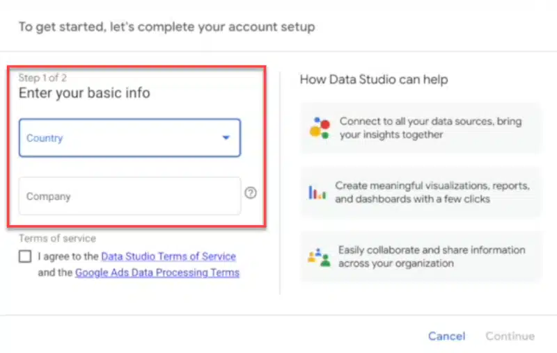 Wenn Sie Looker Studio zum ersten Mal verwenden, werden Ihnen einige anfängliche Fragen gestellt, z. B. Ihr Land, Ihr Firmenname, ob Sie E-Mails erhalten möchten usw.