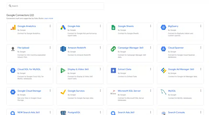 Da Looker Studio ein Google-Produkt ist, eignet es sich am besten zum Sammeln und Melden von Google-Daten wie Google Ads, Search Console, Google Analytics, YouTube usw. Aber über die Community Connectors können Sie Daten aus anderen Kanälen wie Facebook-Anzeigen, LinkedIn-Anzeigen, Bing und andere Quellen.