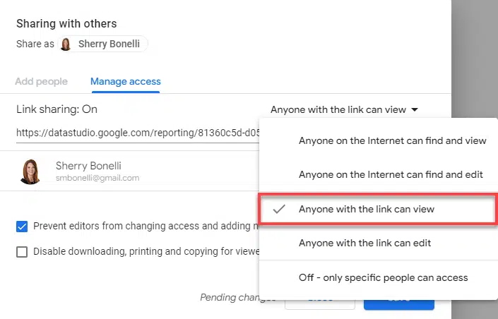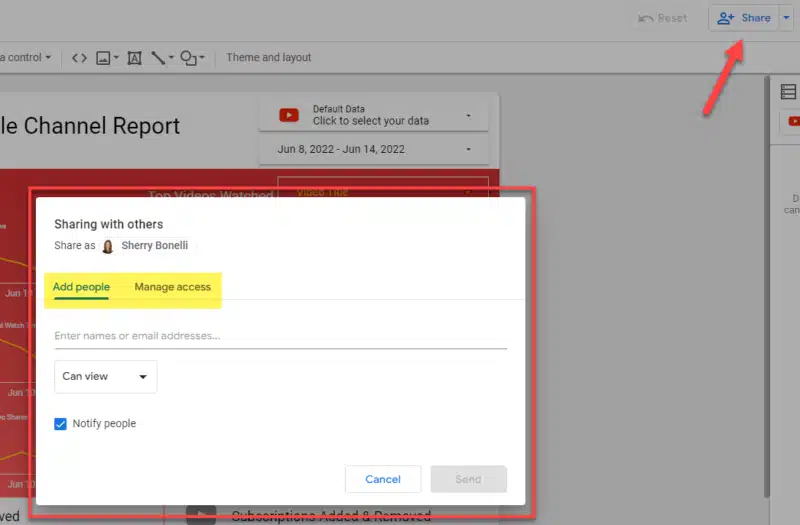 Google Looker Studio verwendet die gleichen Funktionen wie Google Docs und Google Sheets. Sie müssen also nur auf die Schaltfläche „Teilen“ klicken, damit Ihre Kunden oder andere Mitglieder Ihres Teams die Berichte anzeigen oder bearbeiten können. (Für Kunden empfehle ich, ihnen nur die Berechtigung zum Anzeigen zu erteilen.)