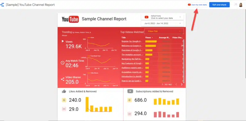 Sobald die Daten erfolgreich hinzugefügt wurden, werden Ihre Informationen in der Beispielberichtsvorlage angezeigt und Sie sehen ein grünes Häkchen neben der Schaltfläche „Eigene Daten verwenden“.