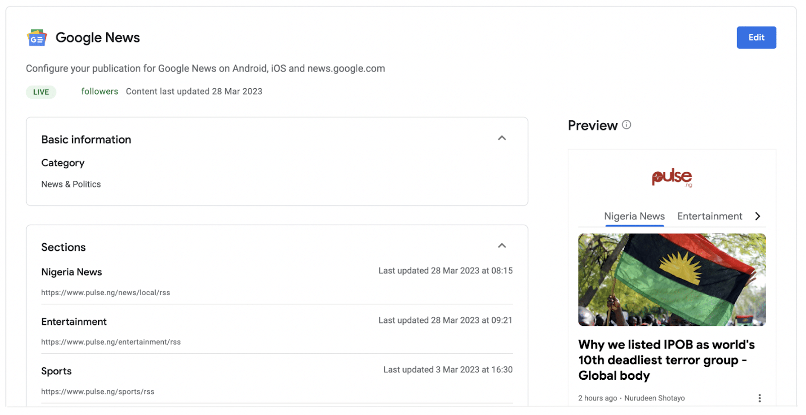 - Themenoptimierung : Google News-Algorithmen nutzen stark die Themenebene des Google Knowledge Graph. Im Publisher Center können Sie Inhalte in Abschnitts-Feeds klassifizieren, um Ihr Fachwissen zu bestimmten Themen zu demonstrieren. Idealerweise ist mindestens einer dieser Abschnitte auf lokale Nachrichten zugeschnitten.