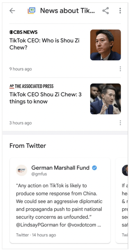 Aber zumindest sollten Marken, die in Google News Fuß fassen wollen, in regelmäßiges Tweeten investieren, um für den Abschnitt „Von Twitter“ in den Berichten „Vollständige Abdeckung“ und das Twitter-Karussell in der universellen Suche in Frage zu kommen, das auf etwa 35 % erscheint alle Anfragen zu US-Nachrichten laut NewzDash.