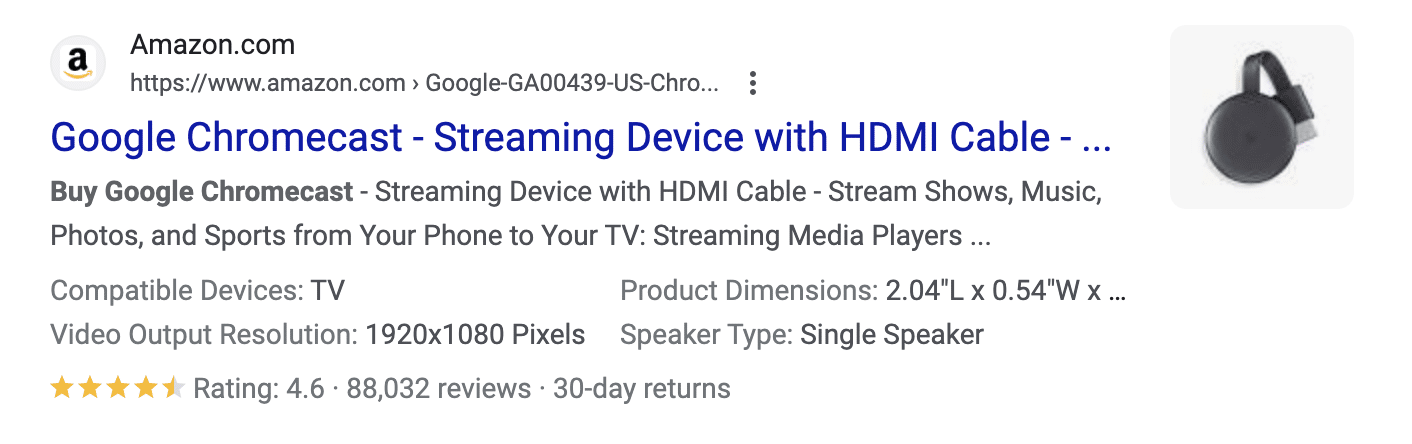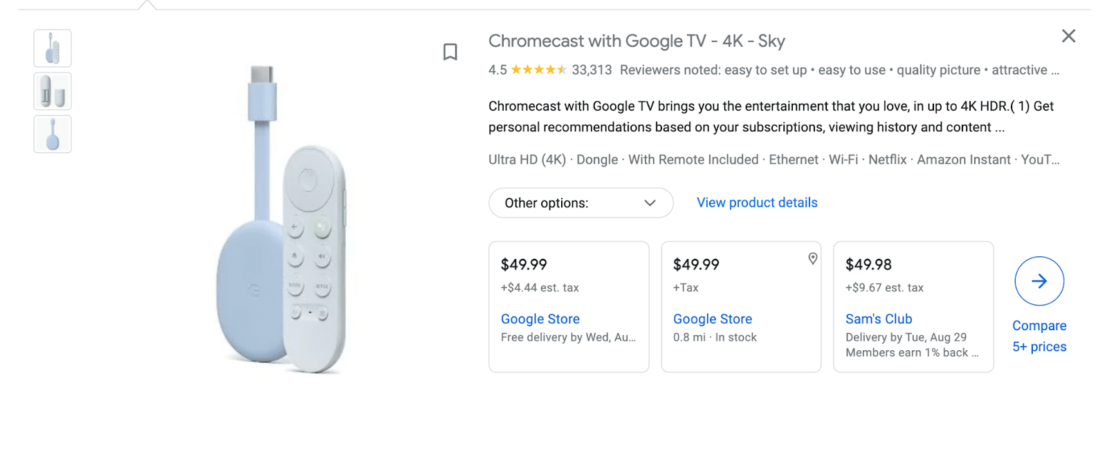 Da nur grundlegende Produktdaten bereitgestellt werden, ähneln die kostenlosen Standardeinträge von Google einem Standardsuchergebnis mit einigen zusätzlichen produktspezifischen Informationen.