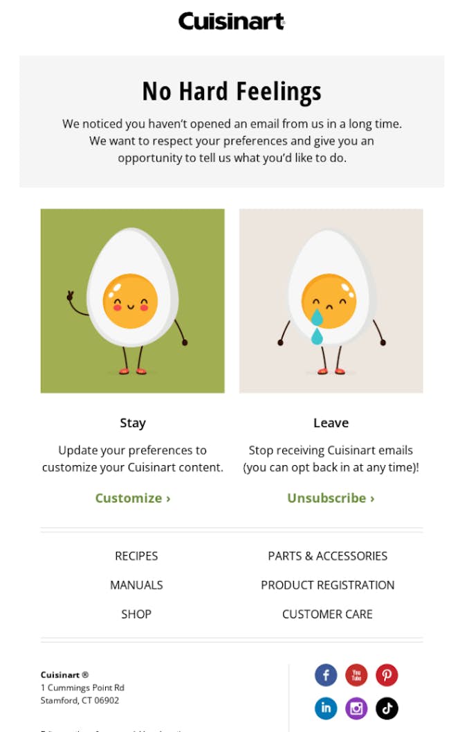 Hier ist eine tolle E-Mail von Cuisinart, die es auf den Punkt bringt und die Leute um ein einfaches „Ja“ oder „Nein“ bittet, weiterhin E-Mails zu erhalten.