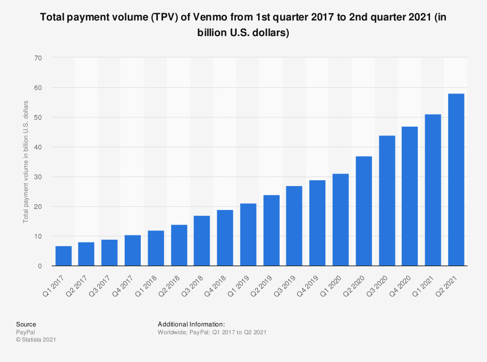 - Venmo hatte im Jahr 2020 eine Gesamtzahlung von rund 160 Milliarden US-Dollar abgewickelt.