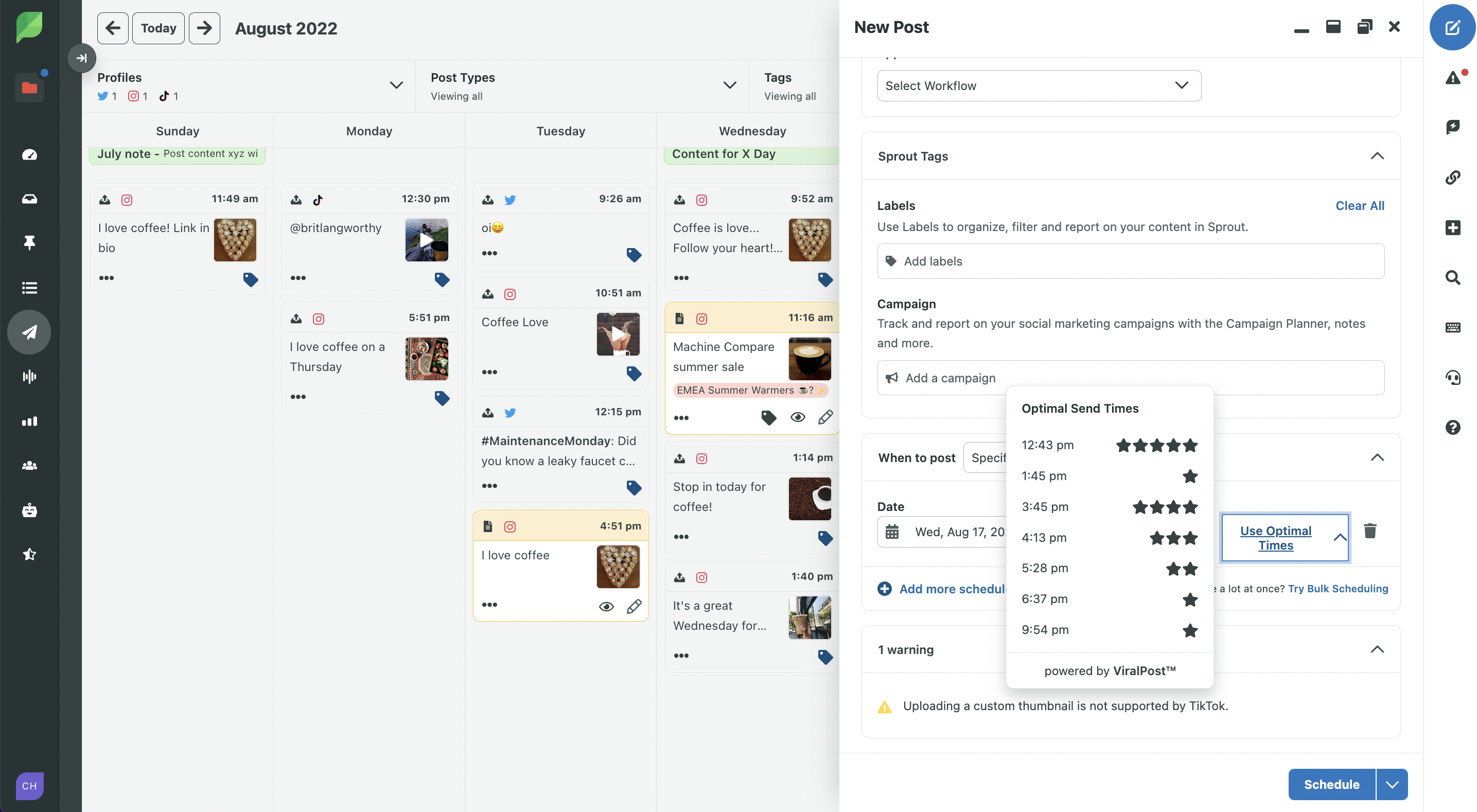 Das Veröffentlichen mehrerer Posts pro Tag kann chaotisch werden, wenn sie nicht verteilt sind. Erstellen Sie einen TikTok-Zeitplan und planen Sie Ihre Posts im Voraus, um organisiert zu bleiben. Mit Sprout Social können Sie sogar optimale Sendezeiten nutzen, um Posts zu Spitzenzeiten zu planen.