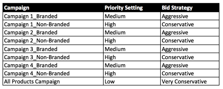 Stellen Sie schließlich sicher, dass eine Kampagne für alle Produkte vorhanden ist. Wenn eines in jedem PPC-Konto mit Shopping in jeder Struktur konsistent sein sollte, dann ist es eine All Products-Kampagne. Diese Kampagne sollte ein niedriges Gebot und eine niedrige Prioritätseinstellung haben. Sein Zweck besteht darin, als Sammelpunkt für die Produkte zu fungieren, auf die Sie nicht speziell ausgerichtet sind, sowie als Sicherheitsnetz für den Fall, dass das Budget anderer Shopping-Kampagnen aufgebraucht ist.