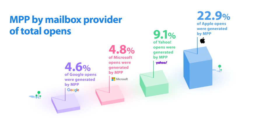 Der Mail-Datenschutz wirkt sich auf die Interaktionsdaten von Empfängern aus, die ihr E-Mail-Konto in der Apple Mail-App auf einem ihrer Geräte konfiguriert und MPP aktiviert haben. Dies ist jedoch nicht auf Apple Mail beschränkt. Wenn sich ein Benutzer mit der Apple Mail-App, Gmail oder Yahoo! E-Mail-Postfächer könnten falsche Öffnungen generieren, wenn der Benutzer MPP aktiviert hat. Um Ihnen einen Eindruck davon zu vermitteln, wie sich MPP auf Ihr E-Mail-Programm auswirken könnte, sehen Sie sich hier die Ergebnisse der ersten Woche nach dem Start von MPP an.