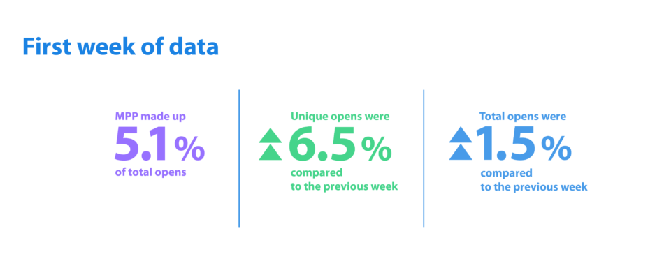 In den ersten 7 Tagen von MPP machte MPP 5 % aller Öffnungen aus. Die Gesamtzahl offener Ereignisse stieg um 1,5 %, was innerhalb unseres normalen Bereichs liegt. Unique Opens stiegen jedoch um 6,5 %. Das ist fast das Doppelte des größten einwöchigen Anstiegs der eindeutigen Öffnungszahlen, den wir in den letzten 6 Monaten beobachtet haben.