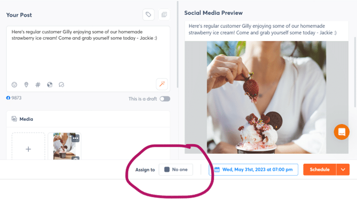 Jackie arbeitet in einer Bäckerei-Franchise. Sie ist auf das Backen von Kuchen und die Herstellung von großartigem Eis spezialisiert. Social Media ist nicht wirklich ihr Ding! Aber sie hat ein paar schöne Fotos von Kunden gemacht, die ihr brandneues hausgemachtes Eis genossen, und sie hat sie als Moderatorin in ihrer Agorapulse-App gepostet. Diese Beiträge werden nicht veröffentlicht, da sie eine Moderatorenrolle hat. Sie können jedoch einem Administrator zugewiesen werden, der sie bearbeiten, genehmigen und veröffentlichen kann. Dadurch wird sichergestellt, dass Jackies Beitrag und Fotos mit dem Ton der Marke übereinstimmen, vollständig gesetzeskonform sind und gleichzeitig eine gewisse Individualität und lokalisierte Inhalte bewahren.