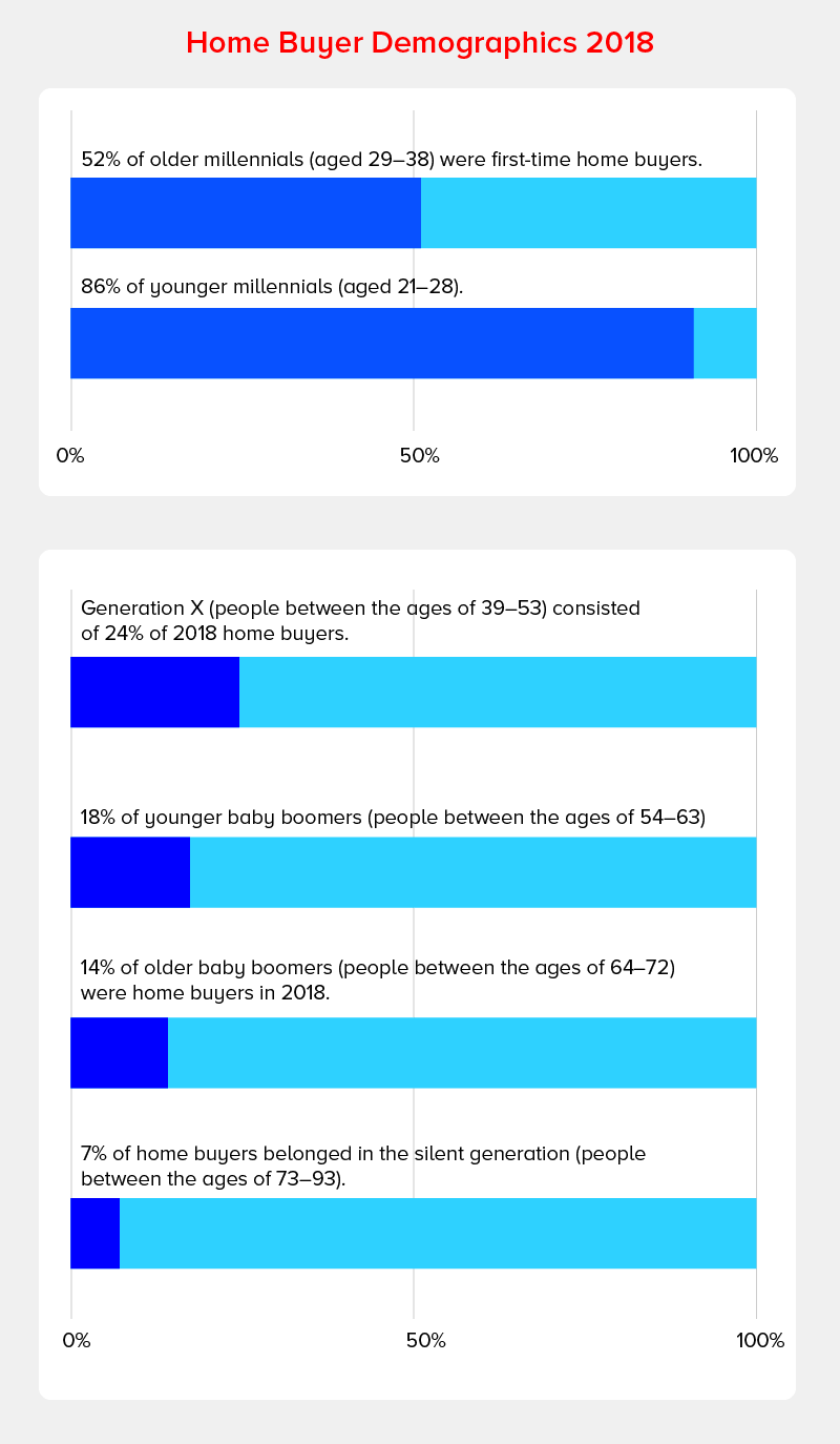 Die Millennials stellen die größte Bevölkerungsgruppe auf dem Markt dar, da Menschen im Alter zwischen 39 und 53 24 % ausmachten, Menschen im Alter von 54 bis 63 18 % ausmachten, Menschen im Alter zwischen 64 und 72 14 % ausmachten und schließlich Menschen im Alter von 73 bis 93 ( Stille Generation) machten 7 % der Hauskäufer im Jahr 2018 aus.