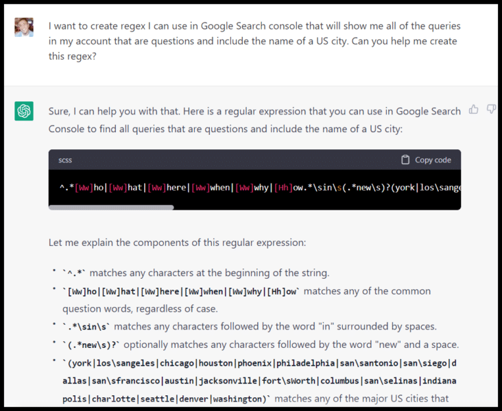 Wie bei der GSC-API kann die Verwendung von regulären Ausdrücken (regex) in der Search Console eine großartige Möglichkeit sein, Keyword-Targeting-Möglichkeiten aufzudecken: