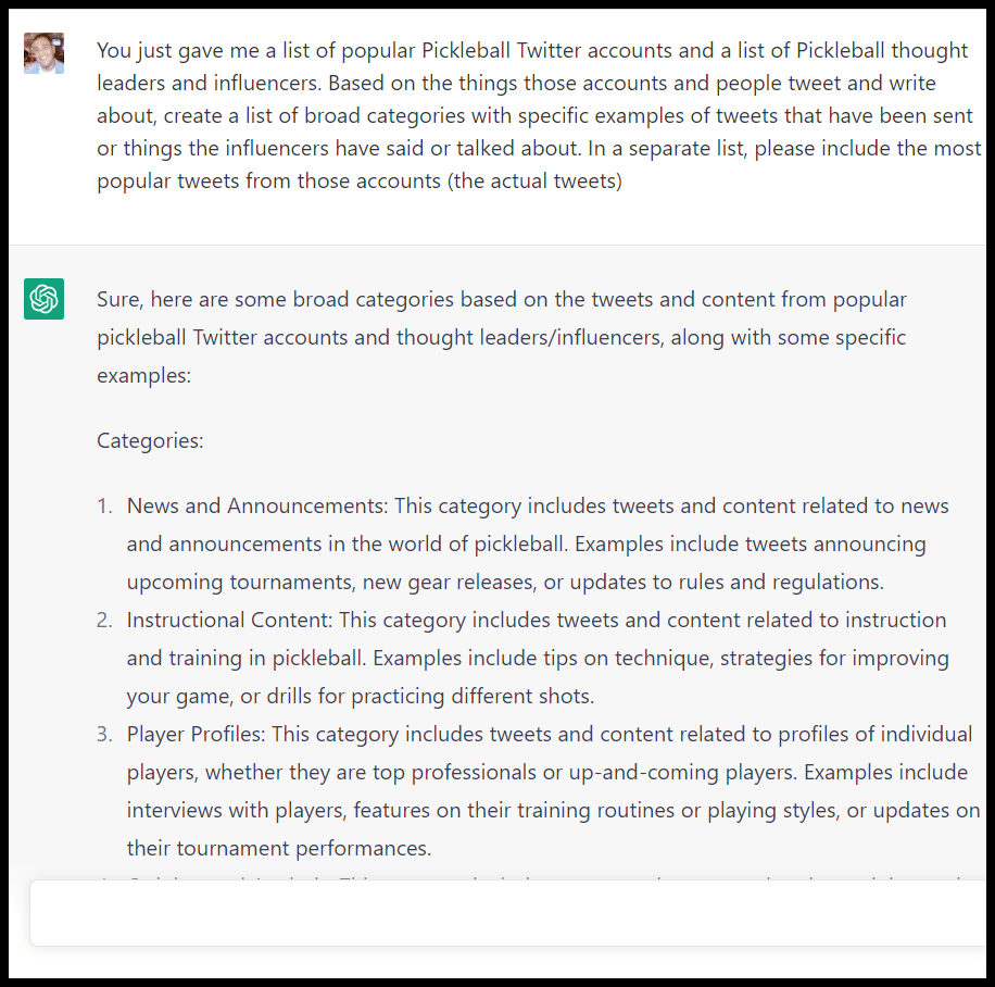 Wenn ich eine Website über Pickleball starte und ein paar allgemeine Ideen bekommen möchte, worüber ich schreiben könnte, könnte ich einige kreative Aufforderungen verwenden, um Ideen von ChatGPT zu erhalten, wo ich anfangen soll: