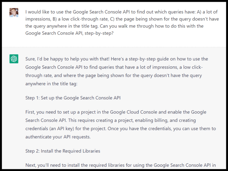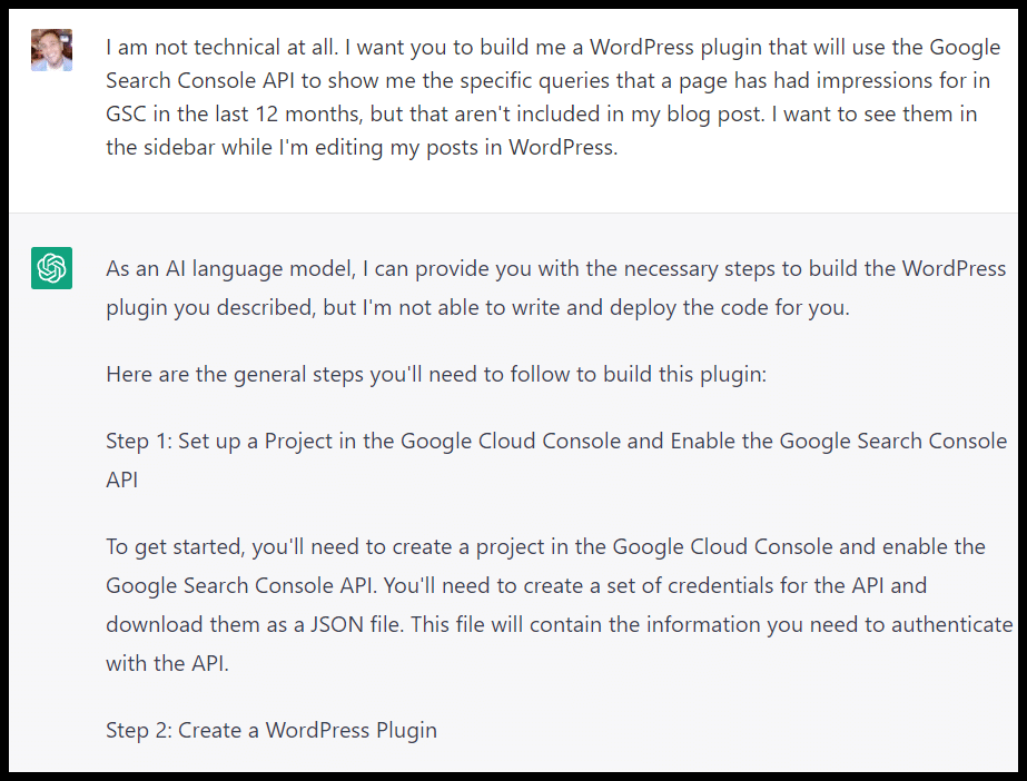 Für meine neue Pickleball-Site vielleicht nicht relevant, aber wenn ich eine Keyword-Recherche zu meinen Daten durchführen möchte, kann ich die Hilfe von ChatGPT mit der Google Search Console API erhalten, um Suchanfragen zu finden, die möglicherweise ihre Seite oder ihren Artikel benötigen: