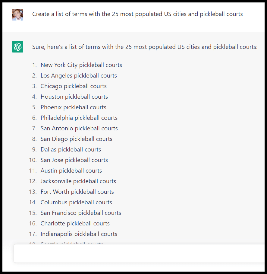 ChatGPT verfügt nicht über die neuesten Daten und ist kein umfassendes Keyword-Recherche-Tool. Aber es kann mir helfen, ein schnelles Gefühl für die Wettbewerbslandschaft einer Nische zu bekommen und mit hochrangigen Ideen zu beginnen: