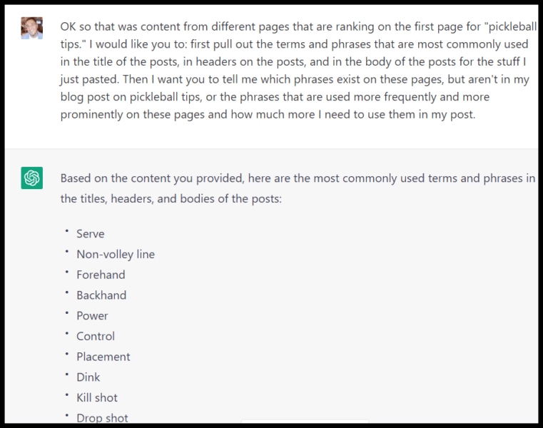 Wir können ChatGPT verwenden, um unseren Artikel mit dem zu vergleichen, was für bestimmte Begriffe rankt. Auch hier handelt es sich nicht um ein natives SEO-Tool, daher unterscheiden sich die Daten von denen, die diese Tools verwenden.