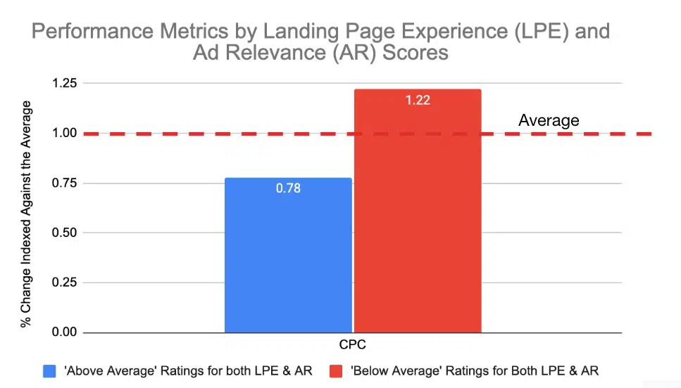 Das Gleiche gilt für die Kosten pro Klick. Wenn die Bewertungen für beide Kennzahlen (LPE und AR) über dem Durchschnitt lagen, lagen die CPCs um 36 % deutlich unter dem Durchschnitt.