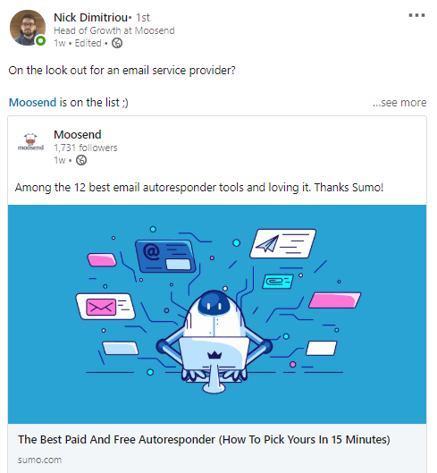 Ermutigen Sie Ihre Mitarbeiter, Ihr Unternehmen zu ihren persönlichen Profilen hinzuzufügen. Dies macht sie automatisch zu Followern und hilft Ihrem Unternehmen, auf der Plattform wahrgenommen zu werden. Außerdem wird es Ihren Mitarbeitern erleichtert, sich mit Ihren Unternehmensaktualisierungen zu beschäftigen und sie mit ihren Verbindungen zu teilen. Sie können Neuigkeiten, Artikel oder Zusammenfassungen mit Ihrer Marke teilen, wie im folgenden Beispiel von Moosend.