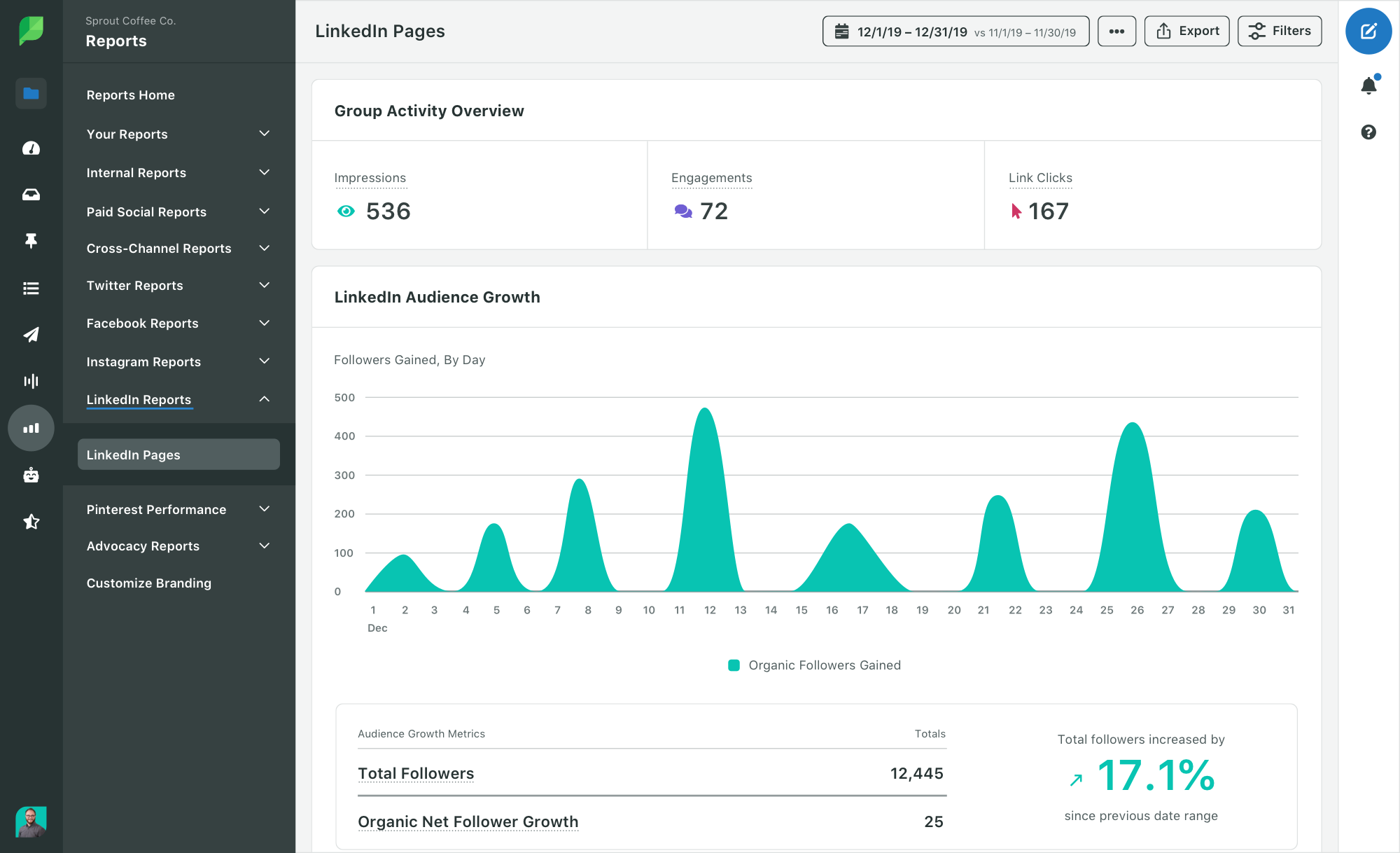 Für Sprout Social-Benutzer bietet die LinkedIn-Integration einen noch besseren Einblick in Ihre Leistungsanalysen. Neben der Analyse des Wachstums und der Bindungsrate Ihrer Unternehmensseiten bietet es auch detaillierte demografische Daten zur Zielgruppe, um Ihre Targeting-Bemühungen zu verbessern. Sie können sogar vergleichen, wie Ihre organischen Inhalte mit Ihren bezahlten Werbeaktionen abschneiden, damit Sie die Auswirkungen Ihrer Investitionen besser einschätzen können.