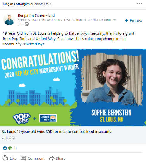 Und wenn jemand mit Ihrem Beitrag interagiert, besteht die Möglichkeit, dass er auch in den Feeds seiner Kontakte erscheint, was Ihre Reichweite weiter erhöht. Hier ist ein Beispiel: