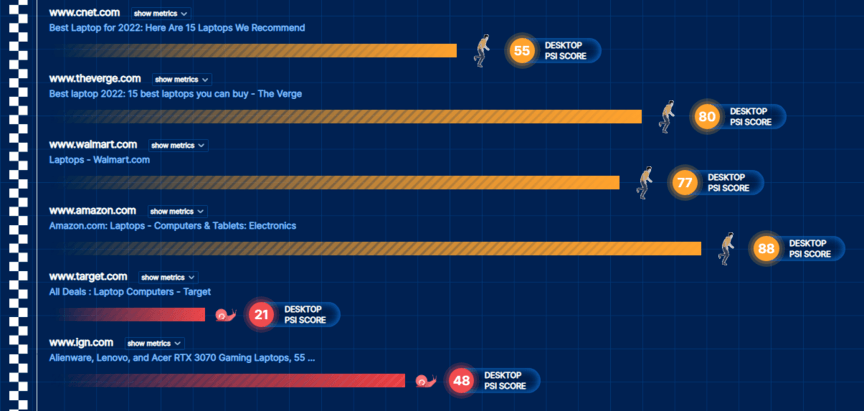 Mit SERP Racer können Sie ein Ziel-Keyword eingeben, um eine Liste der bestplatzierten Websites für diesen Begriff anzuzeigen. Von dort aus können Sie analysieren, wie Ihre Website im Vergleich zu Ihren Mitbewerbern abschneidet. Dieses Tool kann auch die Seitengeschwindigkeit jeder Website hervorheben, um zu sehen, wie schnell jede Seite für Benutzer geladen wird.
