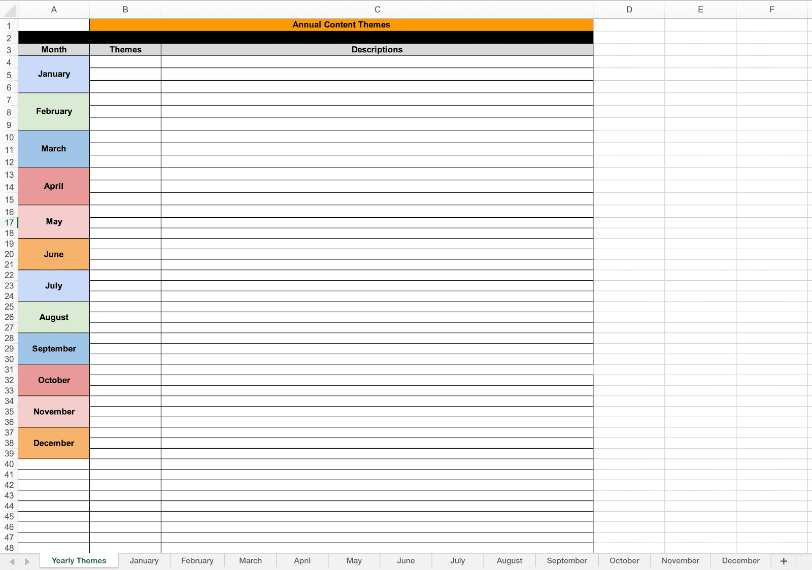 - Als Liste der monatlichen Themen – mit separaten Registerkarten für jeden Monat.