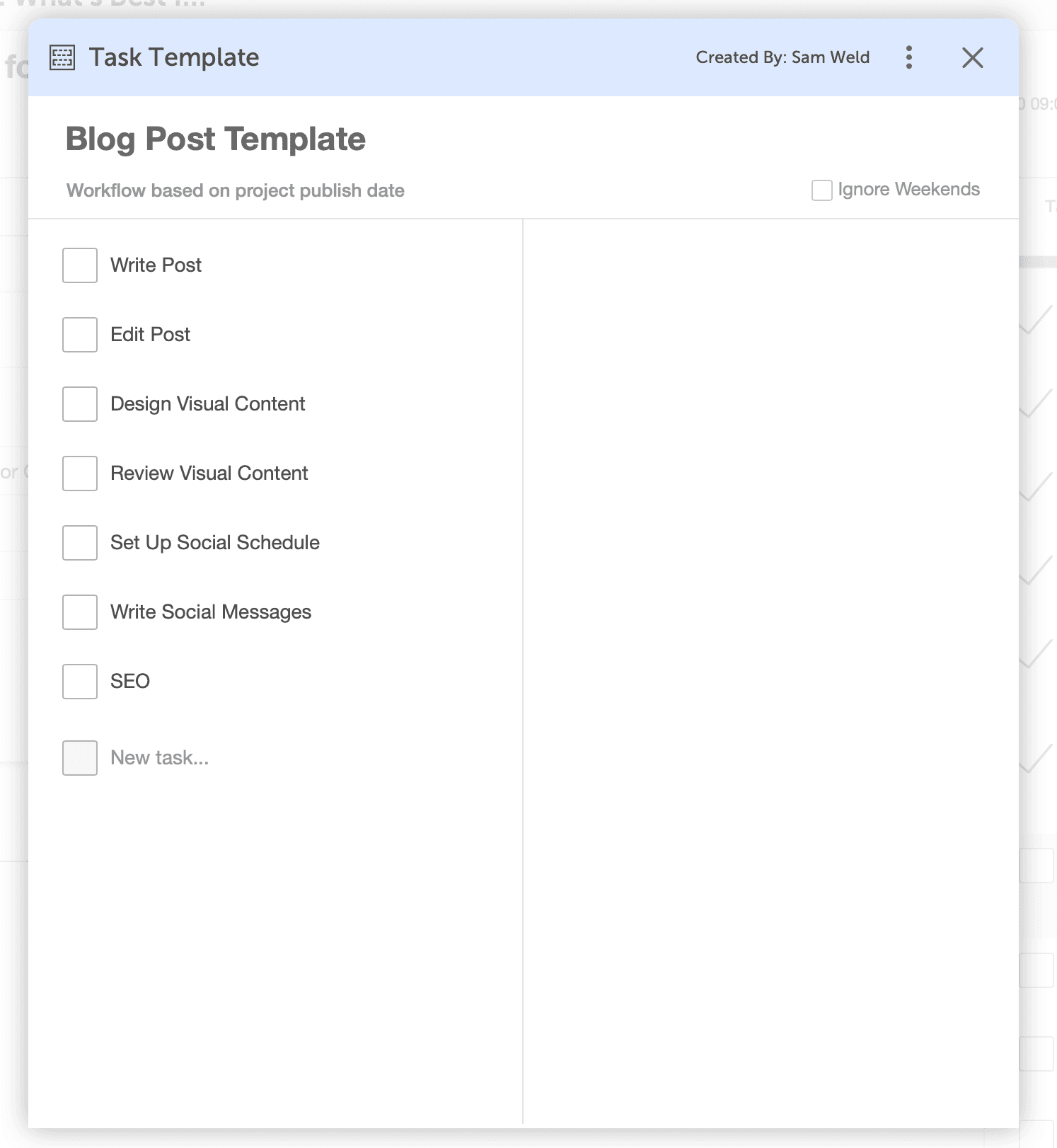 Sie möchten keine Aufgabe für eines Ihrer neuen Marketingprojekte vergessen? Dann werden Sie Checklisten lieben. Marketingaufgaben sind entscheidend, um Ihre Content-Themen von der Idee in die Realität umzusetzen. Diese Aufgaben sind alle Einzelschritte, die Sie ausführen müssen, um einen Blogbeitrag zu veröffentlichen, einen E-Mail-Newsletter zu versenden, ein E-Book zu veröffentlichen und so weiter. Sie werden diesen Teil Ihres Marketingplaners richtig machen wollen; Vermarkter, die Projekte und Aufgaben proaktiv planen, berichten mit 356 % höherer Wahrscheinlichkeit von Erfolgen. Indem Sie Ihre Marketingaufgaben in Checklisten umwandeln, skizzieren Sie Ihren Prozess einmal und folgen ihm einfach jedes Mal, wenn Sie wieder an diesem bestimmten Inhaltsformat arbeiten. Nichts wird durch die Ritzen rutschen ... jemals. So erstellen Sie Ihre eigenen Checklisten für Marketingprojekte:- Identifizieren Sie alle Arten von Projekten, die Sie haben . Wie Blogbeiträge, YouTube-Videos, E-Mail-Newsletter, soziale Kampagnen.