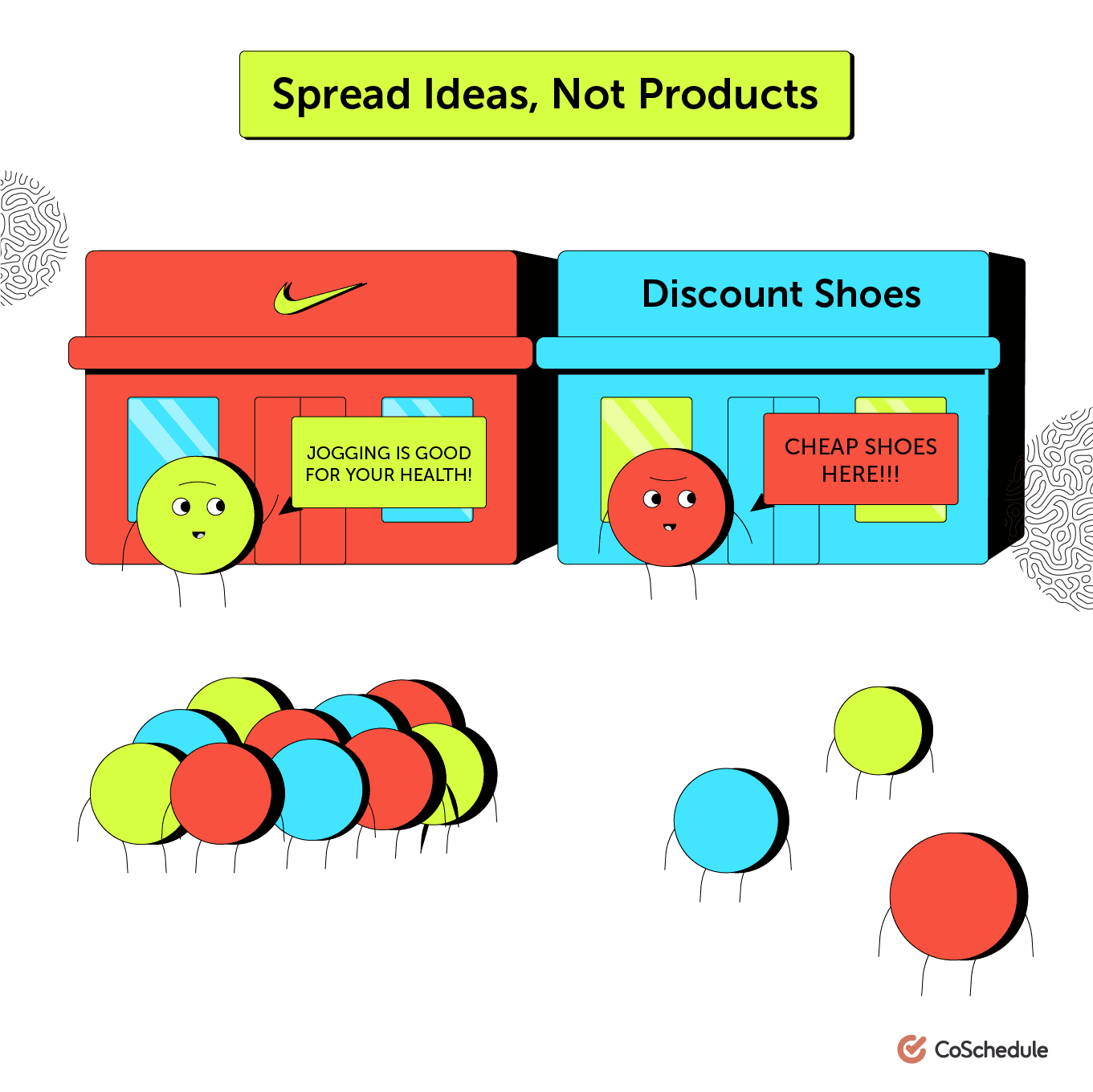 Hier ist das Coole: Bill hat keine Schuhe verkauft; er musste nicht. Stattdessen verkaufte er Joggen und alle damit verbundenen Vorteile. Dies sollte uns als Vermarkter zum Innehalten veranlassen. Anstatt unsere Produkte zu verkaufen, sollten wir die Vorteile verkaufen, die Produkte wie unsere fördern. Laufschuhe sind für Leute wichtig, die joggen, daher ist es immer ein guter erster Schritt, sie beim Joggen zu verkaufen. Dasselbe gilt für uns hier bei CoSchedule. Wir verkaufen eine Familie von Marketingsoftwareprodukten, die Marketingteams dabei helfen, sich zu organisieren und bessere Arbeit zu leisten. Je mehr Menschen ihre geschäftlichen Marketingaktivitäten organisieren und planen müssen, desto mehr Exemplare unserer Software verkaufen wir. Wir haben auch den zusätzlichen Vorteil, dass wir verstehen, warum unsere Kunden überhaupt kaufen, was wir verkaufen. Auch in der Welt des Content Marketings wird viel verkauft. Das ist in Ordnung, verfehlt aber den eigentlichen Punkt, den Bowerman so treffend verstanden hat: Verbreitung von Ideen, nicht von Produkten.