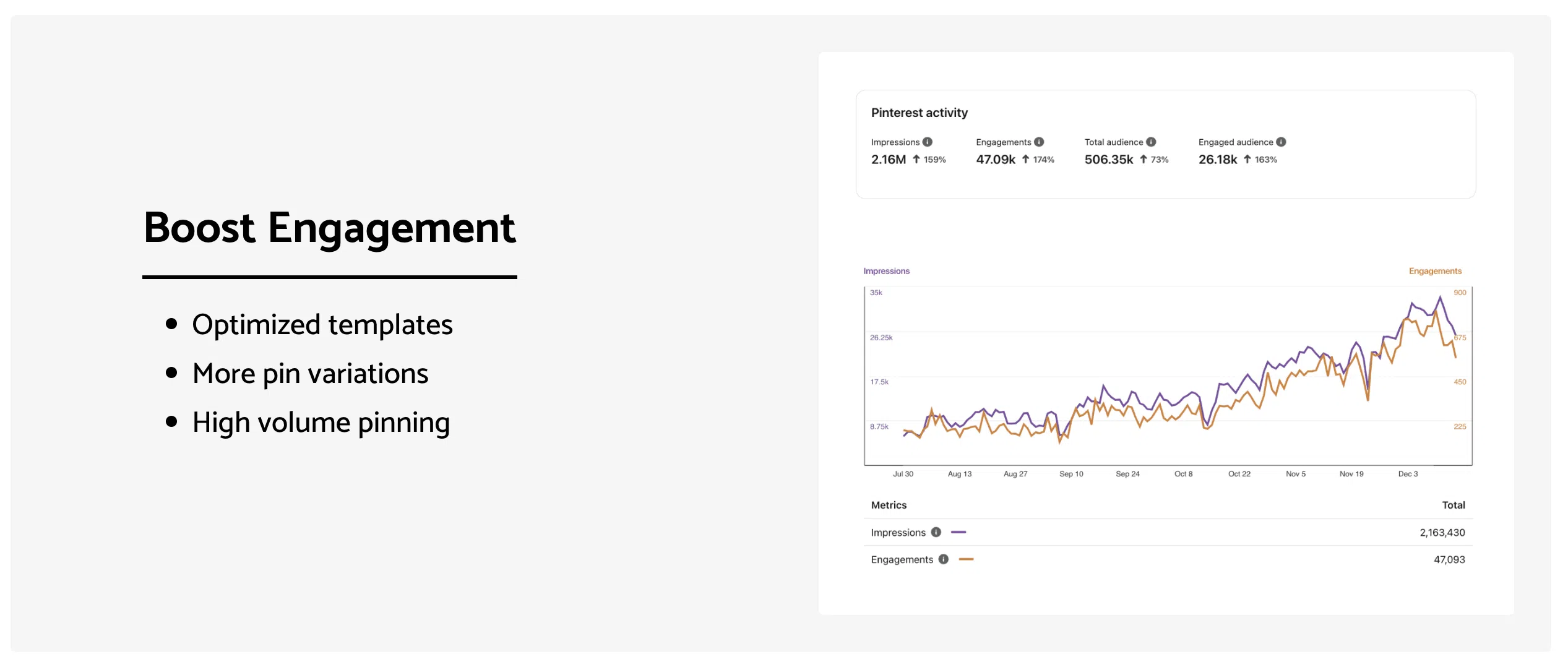 Dies spart Zeit und gewährleistet einen konsistenten Pinning-Zeitplan. Darüber hinaus umfasst die Software Funktionen zur Steigerung des Engagements wie optimierte Vorlagen, mehr Pin-Variationen und Pinning mit hohem Volumen, wodurch das Nutzerengagement auf Pinterest verbessert wird.