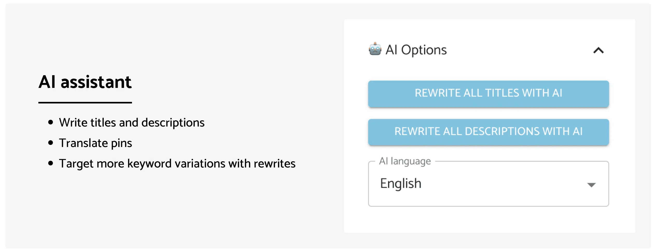 Die KI-Assistentenfunktion unterstützt Benutzer bei der Generierung von Titeln, Beschreibungen, Übersetzungen und der Ausrichtung auf Keyword-Variationen und optimiert so ihre Pinning-Strategie.