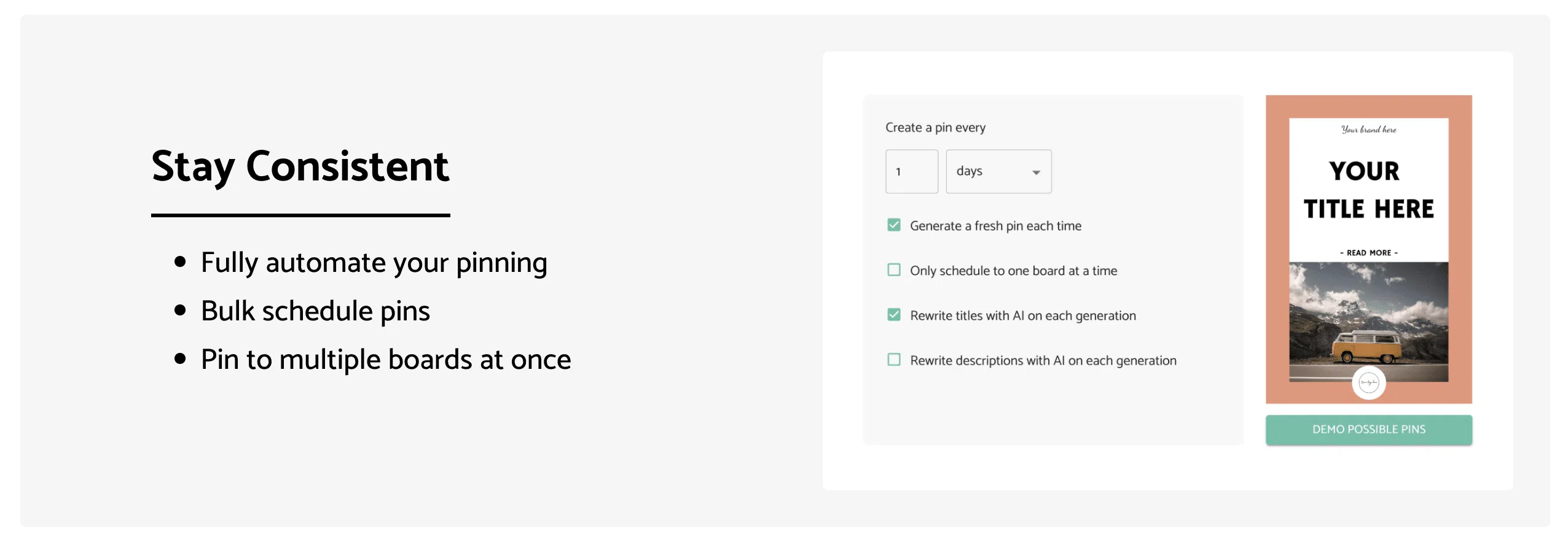 Durch die Automatisierung der Generierung von Pinterest-Pins macht die Software die manuelle Erstellung überflüssig, die zeitaufwändig und kostspielig sein kann.