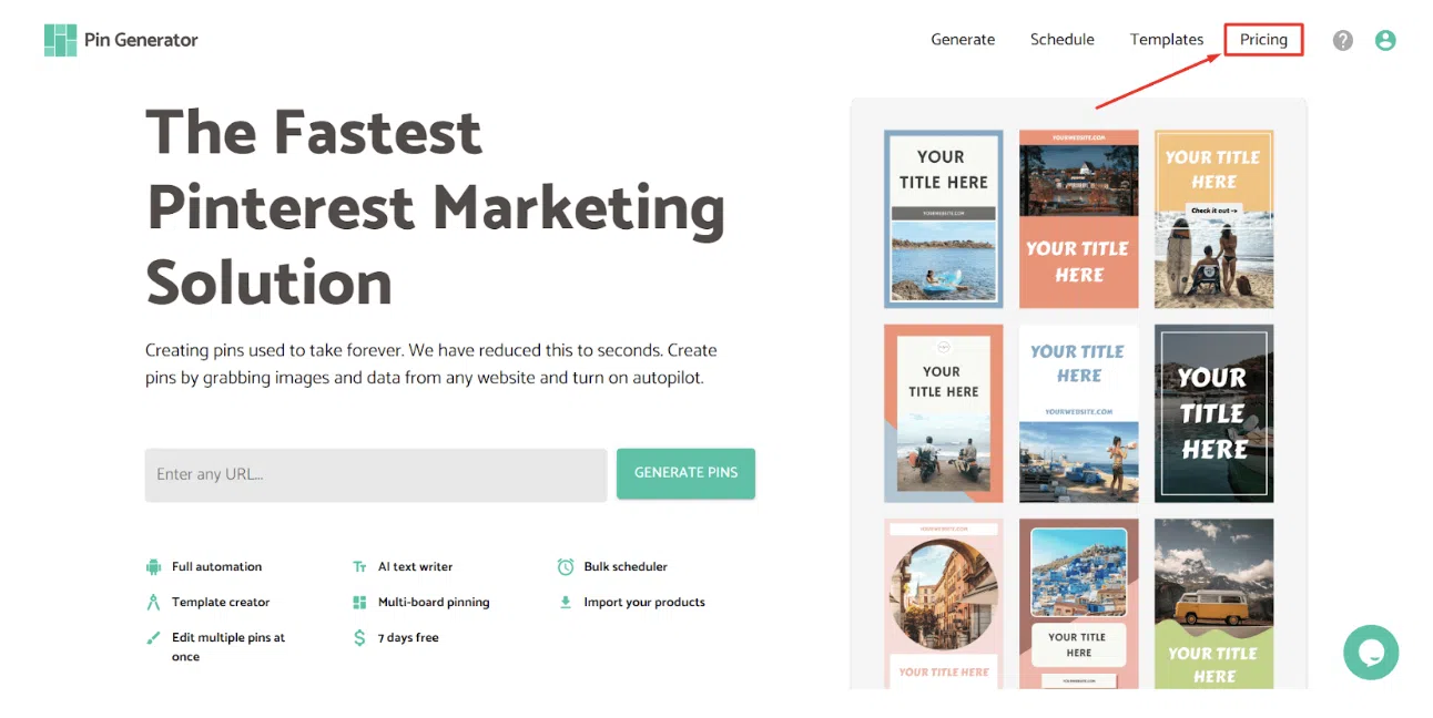 Unabhängig davon, ob Sie ein Geschäftsinhaber oder eine Einzelperson sind, die Ihre Pinterest-Präsenz verbessern möchte, bietet Pin Generator eine breite Palette an Vorlagen, einen KI-Assistenten und Automatisierungsfunktionen, um den Pinnvorgang zu vereinfachen.
