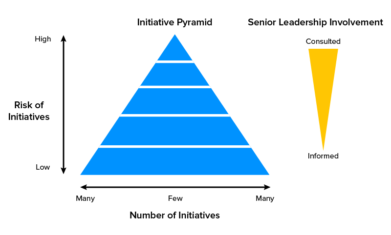 Die linke ist eine Pyramide von Aufgaben/Initiativen, die vom Team durchgeführt werden sollen. Das untere Ende der Pyramide bedeutet, dass viele Aufgaben gleichzeitig ausgeführt werden, und das Diagramm auf der rechten Seite zeigt das Ausmaß der Beteiligung in Bezug auf diese einfachen Aufgaben mit geringem bis gar keinem Risiko.