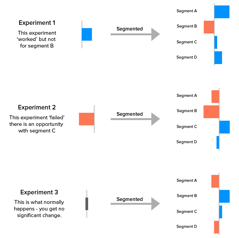 Einzeln betrachtet, schnitt Segment A in Experiment 1 gut mit anderen ab, mit Ausnahme von Segment B. Nun hat das Diagramm den Rückgang in diesem Segment gegenüber den anderen hervorgehoben. Dies könnte Produktmanagern helfen, die Gründe dafür zu finden, was den Durchschnitt langfristig verbessern wird.