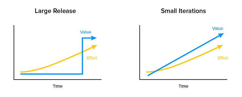 Im Gegensatz dazu würde der agile Ansatz, der kleine Releases und Iterationen unterstützt, sofortige Wertergebnisse zeigen, da Sie gleichzeitig Fehler identifizieren und beheben. Das obige Diagramm zeigt deutlich den Unterschied im Endergebnis der Wahl dieser Produktmanagementansätze .