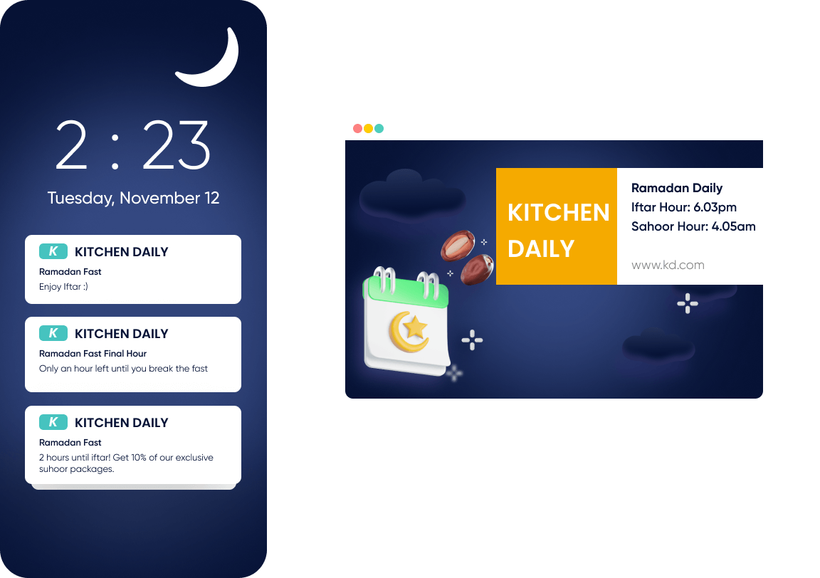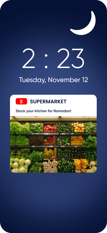 Für Lebensmittelgeschäfte ist dies ein günstiger Zeitpunkt, um Ihren Kunden das Gefühl zu geben, dass Sie für sie da sind. Das Versenden von Erinnerungen an den Beginn von Suhoor und Goodwill-Botschaften nach Iftar kann die Herzen der Kunden gewinnen.
