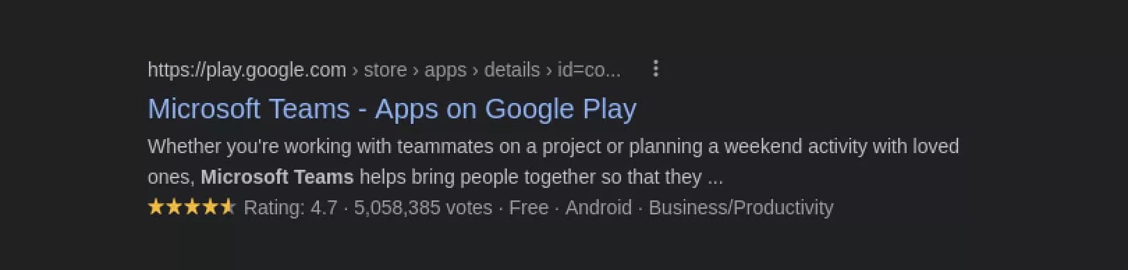 Sie können sehen, dass Sie bereits vor dem Klick auf das Ergebnis – in diesem Fall Microsoft Teams bei Google Play – Informationen über die Bewertung, die Anzahl der Stimmen, die Kategorie usw. haben.