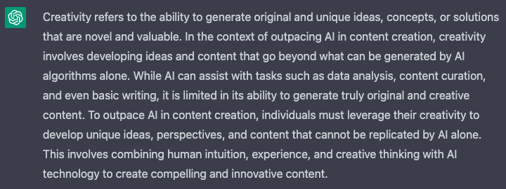 Jetzt, da Sie offen für das Lernen sind, lassen Sie uns über Kreativität sprechen. Wer könnte Ihnen besser zeigen, wie man KI in Sachen Kreativität schlägt, als KI? Hier ist, was ChatGPT zu diesem Thema zu sagen hatte: