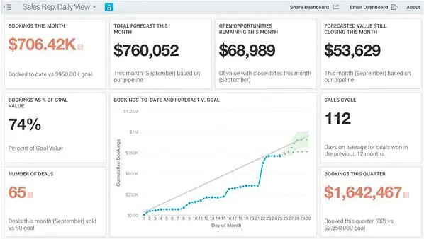 Ihr Verkaufs-Dashboard sollte in der Lage sein, Ihre Verkaufsprognose zu integrieren – damit Sie feststellen können, wie genau sie ist, und möglicherweise Änderungen vornehmen können. Ist Ihr Team auf Kurs, seine Quartalsziele zu erreichen?
