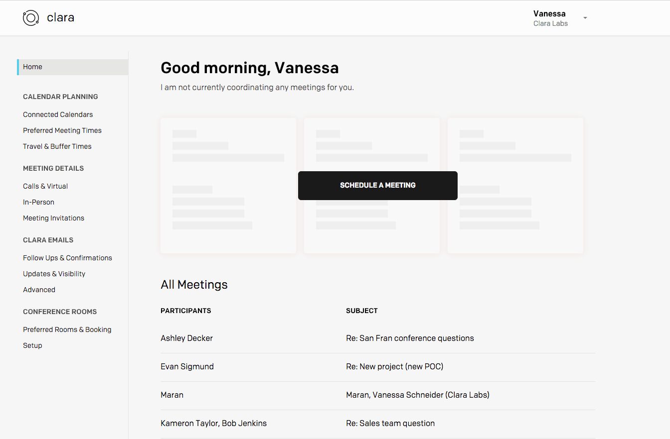 Clara Labs ist ein KI-Planungsdienst, der koordiniert, wann, wo und wie Sie sich mit Interessenten und Mitarbeitern treffen.
