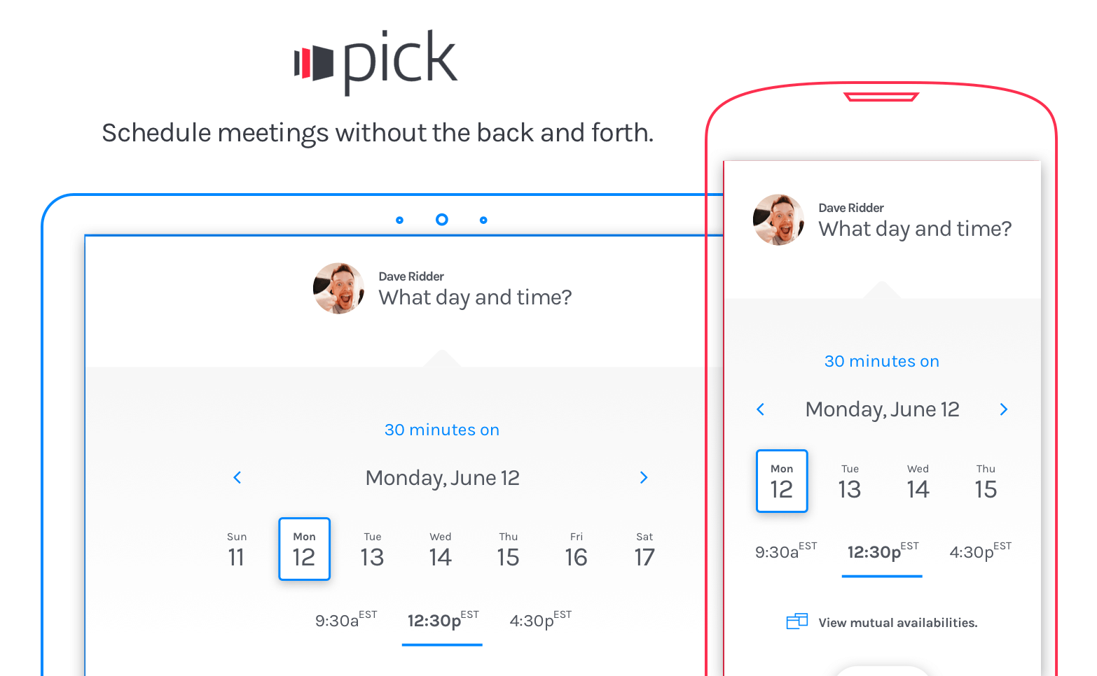 Pick ist ein supereinfaches Tool, das zu einem Zweck entwickelt wurde: die Planung von Besprechungen so schnell, einfach und schmerzfrei wie möglich zu gestalten.
