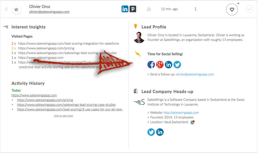 SalesWings verfolgt das Website-Engagement Ihres Leads, wendet Lead-Scores automatisch an und verbindet sich mit Vertriebs- und Marketingtechnologie, um Aktionen auszulösen. Dazu wird ein eigener proprietärer Predictive-Activity-Algorithmus verwendet, der Website-Besuche von Vertriebs- oder Marketing-Leads analysiert und vergleicht und automatisch die 5-20 % mit dem größten Interesse herausfiltert.