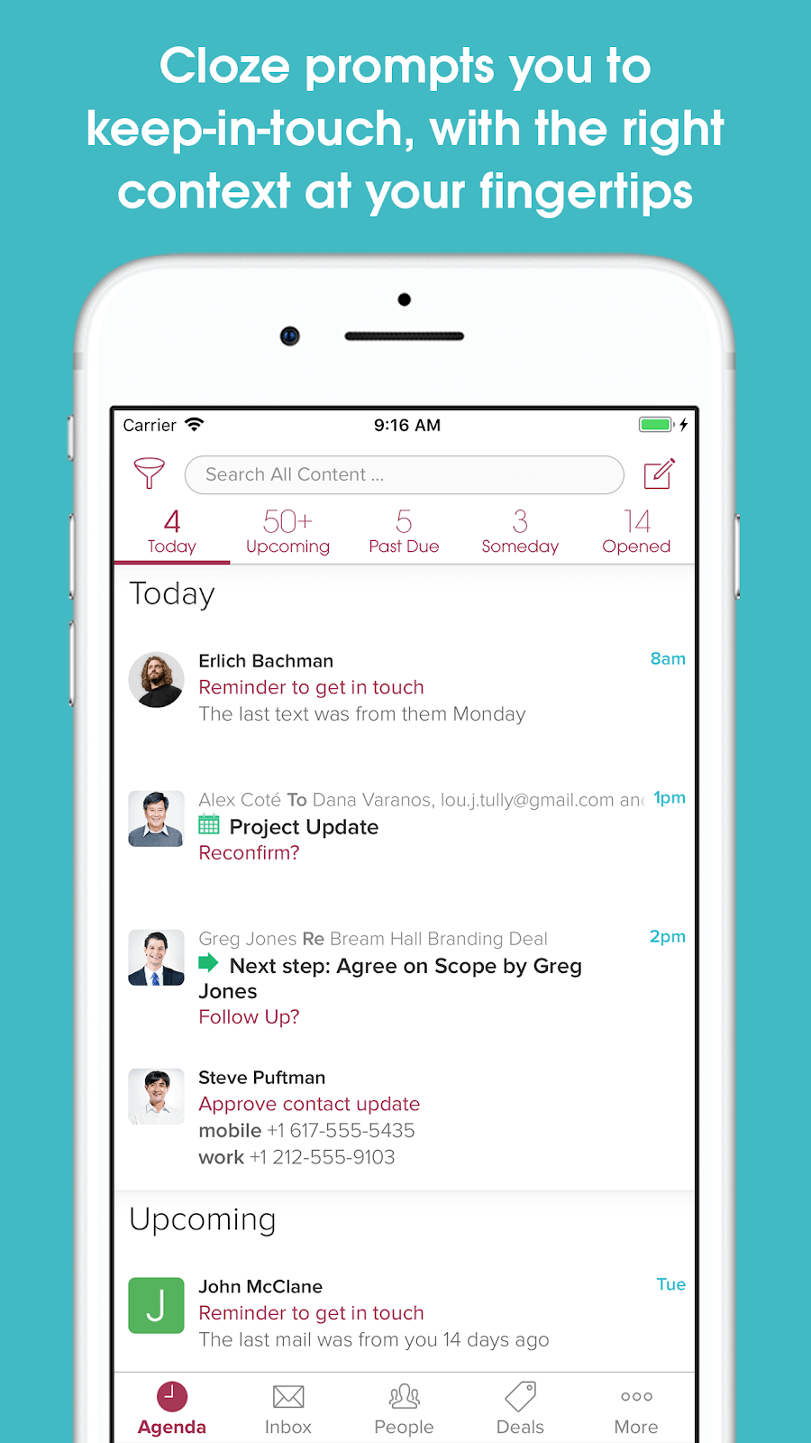 Cloze ist wie ein persönlicher Assistent für Ihre beruflichen Beziehungen, der Sie immer im richtigen Moment auffordert und sich daran erinnert, was Sie nicht tun. Es zieht aus Ihren Apps, um automatisch eine Ansicht jeder Person und jedes Unternehmens zu erstellen – alle ihre Kontaktdaten und Ihren vollständigen Verlauf – jede E-Mail hin und her, Ihre gemeinsamen Telefonate, Besprechungen, Notizen, Dateien, sozialen Medien und Nachrichten.